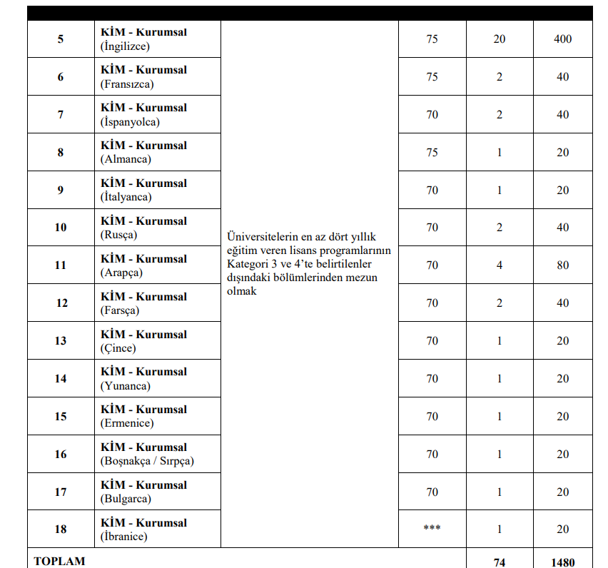 başvurulabilecektir. Söz konusu kategoriler ve sınav dilleri, lisans mezuniyet bölümleri, 1
