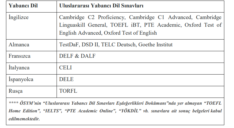 YDS/e-YDS veya ÖSYM’nin eşdeğerlik dokümanında yer alan yabancı dil sınavlarına ilişkin
