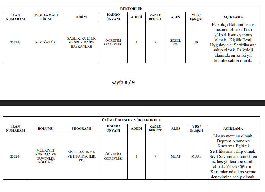 7-İlanda bulunmayan hükümler için 2547 Sayılı Yükseköğretim Kanunu ve Öğretim Üyesi Dışındaki Öğretim Elemanı