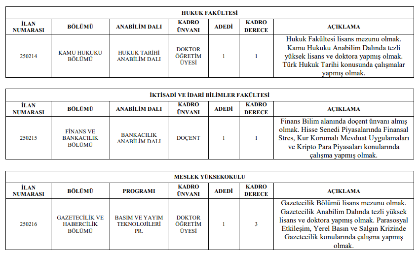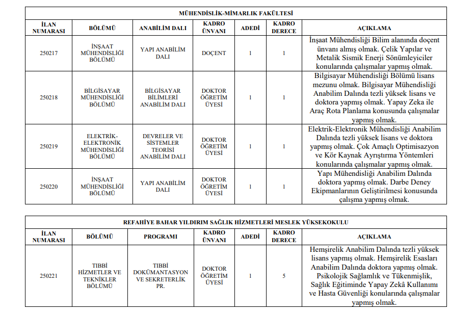 Üniversitemizin aşağıda belirtilen birimlerine 2547 sayılı Yükseköğretim Kanunu, Öğretim Üyeliğine